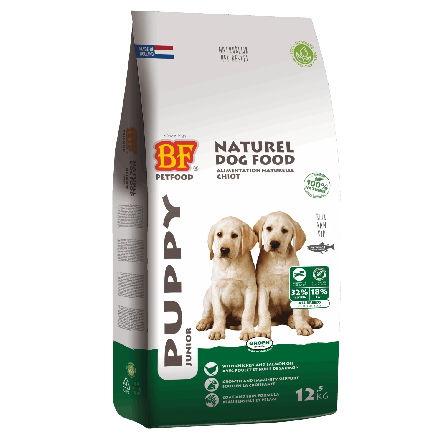 BF Petfood® Puppy. Nederlandse topkwaliteit. Hoogwaardige premium en natuurlijke grondstoffen. Volledige licht verteerbare geĂ«xtrudeerde hondenvoeding voor puppy’s en jonge honden. Met een hoog percentage dierlijke eiwitten o.a. kip. Eiwit/vet percentage van 30/20. Met zalmolie. Tarwe- en glutenvrij. Hoge acceptatie en verteerbaarheid.