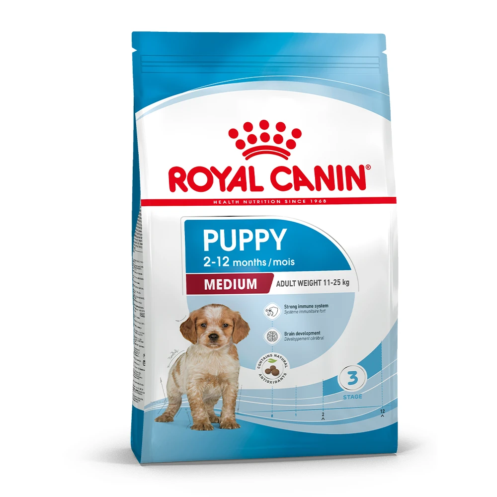 ROYAL CANIN® Medium Puppy Startpakket voor jouw puppy bevat naast een verpakking Medium Puppy 4 kg ook een gratis brochure met giftcard t.w.v. €10 en Mijn Eerste Jaar-boek. Met de giftcard krijg je direct €10 korting op je volgende aankoop op onze website. Het Mijn Eerste Jaar-boek zit boordevol interessante informatie, tips en invulvragen over het eerste jaar van je puppy en heeft ook ruimte voor je favoriete foto’s. Bestel nu dit unieke Startpakket voor dezelfde prijs als ROYAL CANIN® Medium Puppy 4 kg voeding.